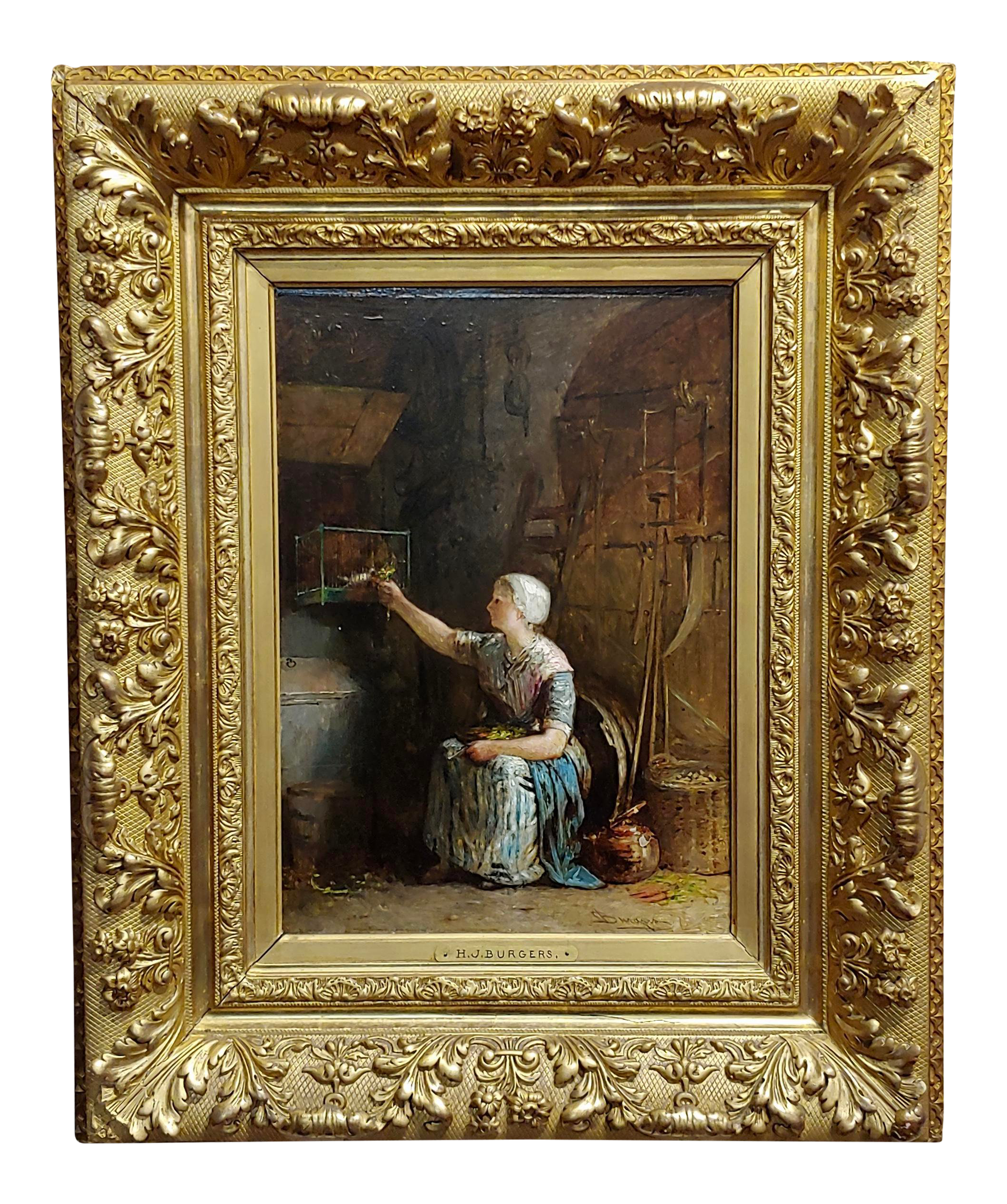 Jacobus Burgers 19th Century Dutch Girl Feeding Her Birds Oil