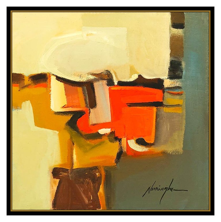R N Raval Large 1950s Abstract Oil Painting On Canvas Signed For