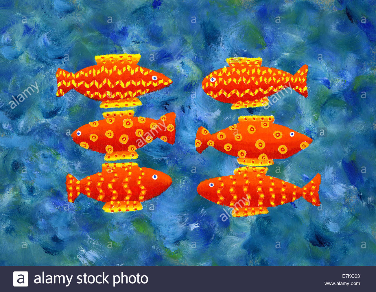 Acrylic Painting Of Six Small Fish With Different Patterns Stock